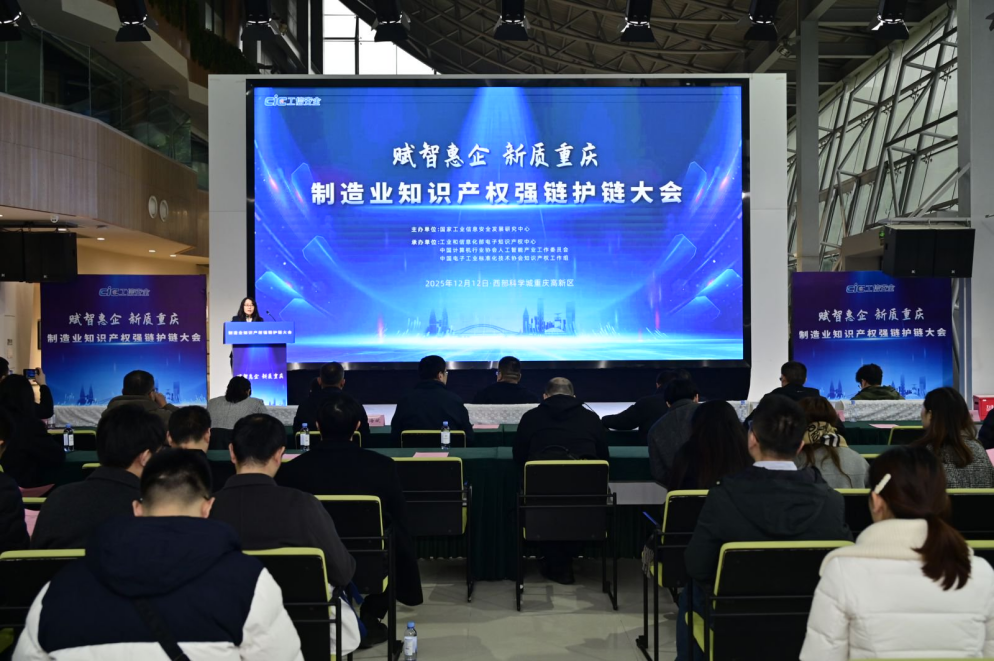 2025年12月12日,制造業(yè)知識產(chǎn)權(quán)強鏈護鏈大會在西部科學(xué)城重慶高新區(qū)成功舉辦。重慶市經(jīng)濟和信息化委員會二級巡視員劉群生出席大會并致辭,工業(yè)和信息化部科技司派員參加。本次大會由國家工業(yè)信息安全發(fā)展研究中心主辦,工業(yè)和信息化部電子知識產(chǎn)權(quán)中心、中國電子工業(yè)標(biāo)準(zhǔn)化技術(shù)協(xié)會知識產(chǎn)權(quán)工委會、人工智能產(chǎn)業(yè)工作委員會知識產(chǎn)權(quán)工作組承辦。