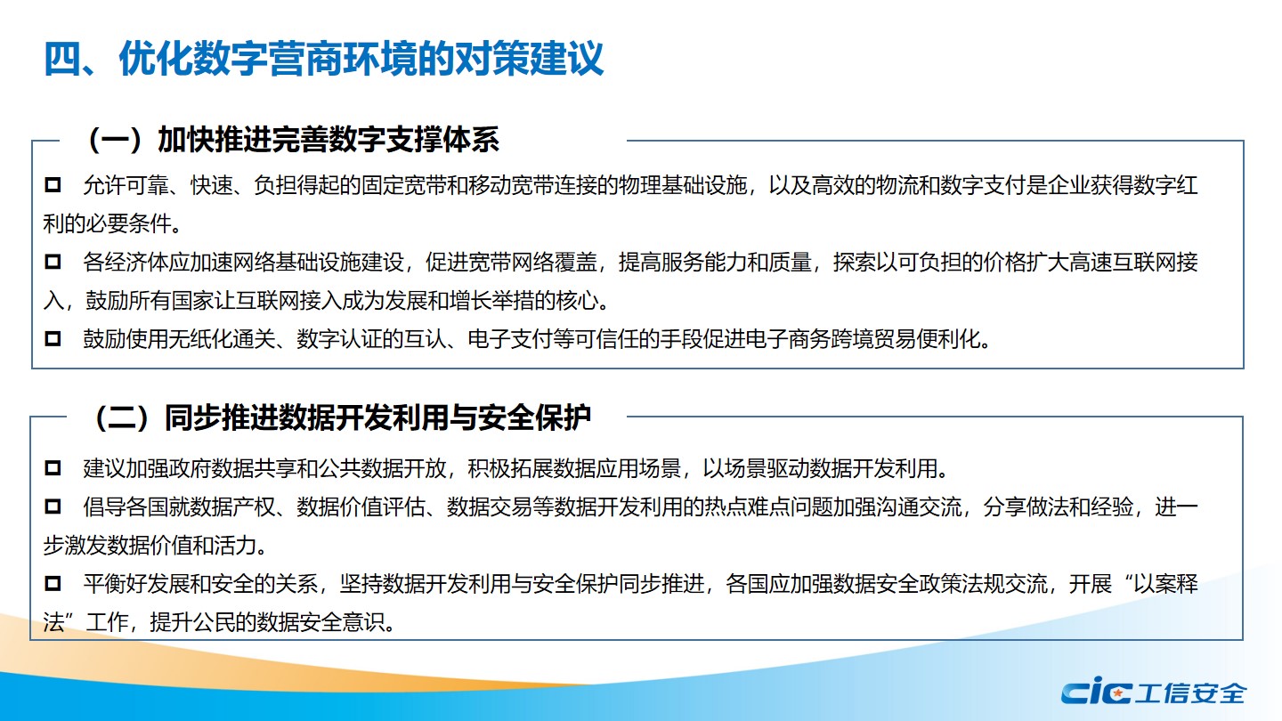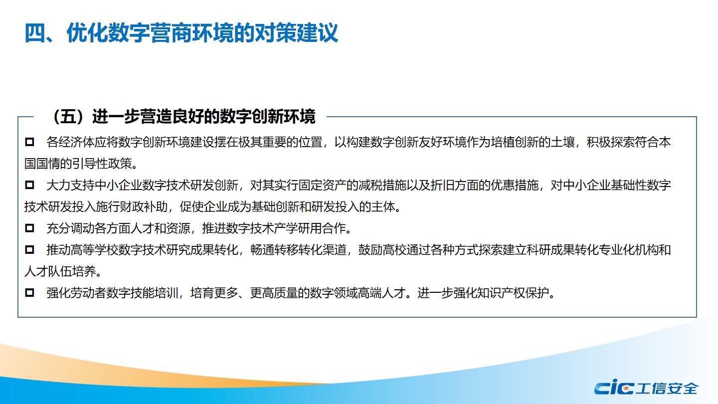 報告強調,持續優化數字營商環境是數字經濟發展的重要條件??傮w來看,各國的數字營商環境還有較大提升空間,這要求各國要進一步完善數字支撐體系,加快網絡基礎設施建設;平衡好發展和安全的關系,堅持數據開發利用與安全保護同步推進;積極放寬和優化數字市場準入,堅持包容審慎的新業態新模式治理規則;構建公平競爭的數字市場體系,并營造良好的數字創新環境。