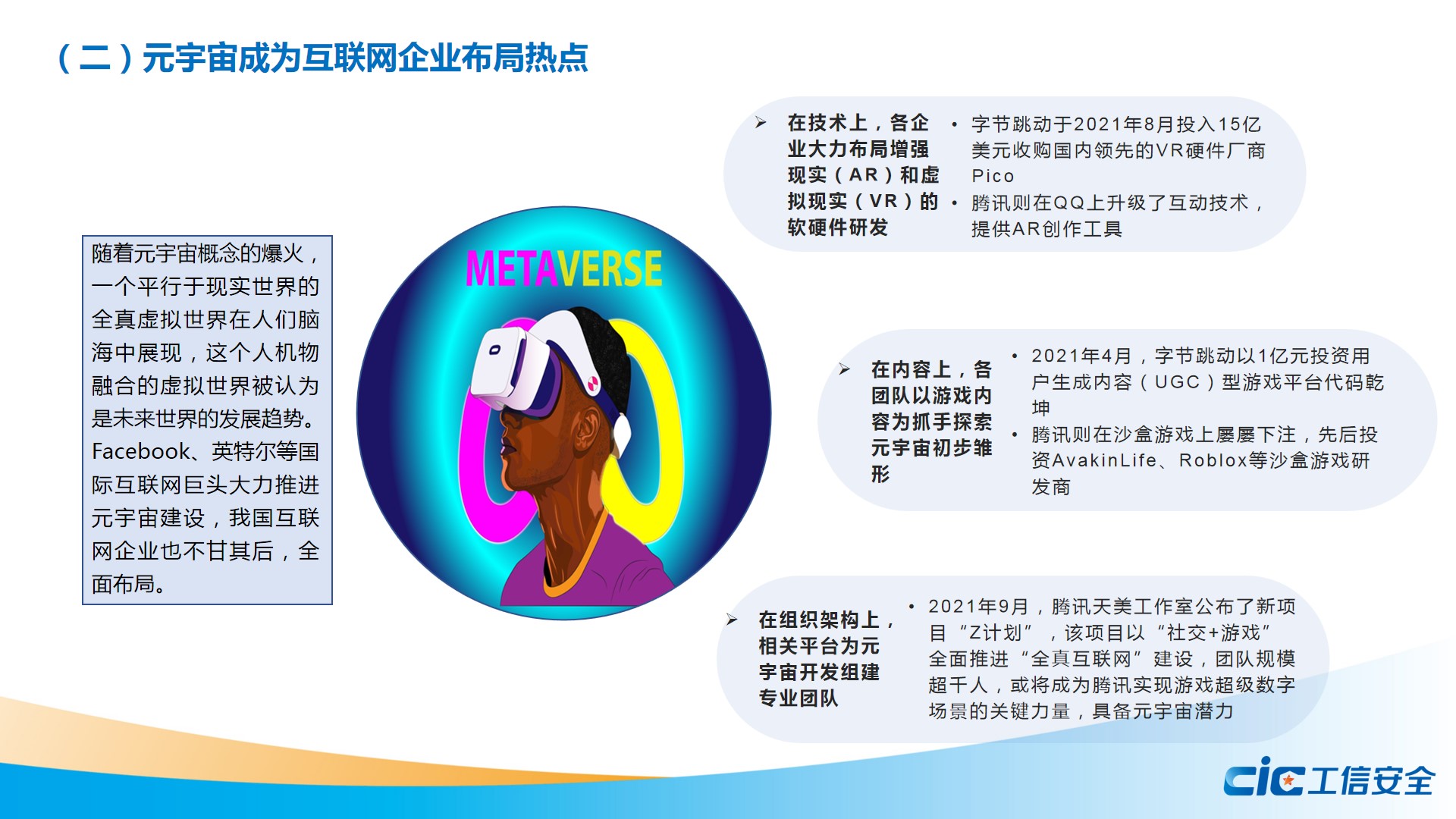 報(bào)告發(fā)現(xiàn),從互聯(lián)網(wǎng)企業(yè)的新趨勢(shì)和新動(dòng)向來看,2021年部分企業(yè)開始把“雙碳”目標(biāo)列入企業(yè)戰(zhàn)略,穩(wěn)步推進(jìn)企業(yè)綠色化進(jìn)程;多家企業(yè)入場(chǎng)元宇宙,從技術(shù)、內(nèi)容和組織架構(gòu)入手,探索構(gòu)建全真互聯(lián)網(wǎng);頭部互聯(lián)網(wǎng)企業(yè)積極布局無人駕駛、車聯(lián)網(wǎng)等應(yīng)用場(chǎng)景,助力科幻場(chǎng)景轉(zhuǎn)變?yōu)楝F(xiàn)實(shí);同時(shí),在反壟斷的政策背景下,互聯(lián)網(wǎng)企業(yè)將無法再依靠“圈地征稅”和“唯流量論”獲取超額利潤(rùn);在平臺(tái)強(qiáng)監(jiān)管政策驅(qū)動(dòng)下,大數(shù)據(jù)殺熟、強(qiáng)制數(shù)據(jù)采集、“996”等問題的解決也將迎來轉(zhuǎn)折。