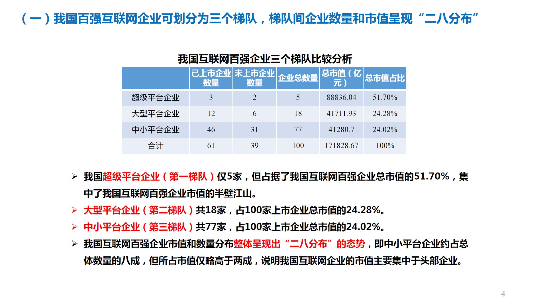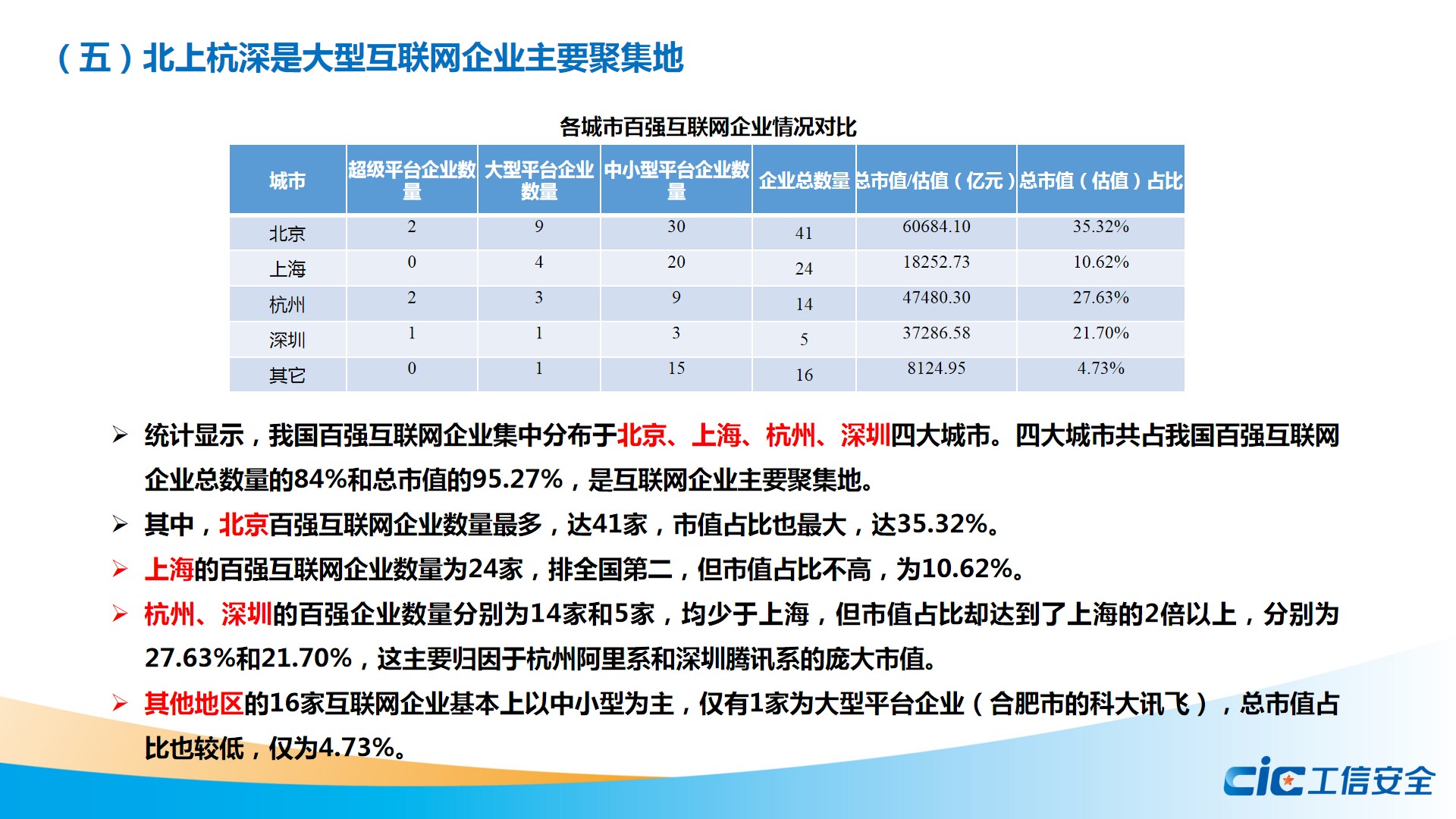 報(bào)告指出,我國(guó)百?gòu)?qiáng)互聯(lián)網(wǎng)企業(yè)分為超級(jí)平臺(tái)企業(yè)、大型平臺(tái)企業(yè)、中小平臺(tái)企業(yè)三個(gè)梯隊(duì),第一梯隊(duì)的五家超級(jí)平臺(tái)企業(yè)占到百?gòu)?qiáng)企業(yè)總市值一半以上。這些企業(yè)分屬網(wǎng)絡(luò)銷售、生活服務(wù)、社交娛樂、信息咨詢、金融服務(wù)、計(jì)算應(yīng)用等六大類平臺(tái),其中生活服務(wù)類平臺(tái)的數(shù)量和市值占比最高。2021年,受平臺(tái)反壟斷、教育“雙減”、中概股退市威脅等影響,互聯(lián)網(wǎng)企業(yè)市值呈現(xiàn)普跌態(tài)勢(shì)。在地域分布方面,北京、上海、杭州、深圳是我國(guó)大型互聯(lián)網(wǎng)企業(yè)的主要聚集地,占據(jù)了我國(guó)百?gòu)?qiáng)互聯(lián)網(wǎng)企業(yè)總數(shù)量的84%和總市值的95.27%。