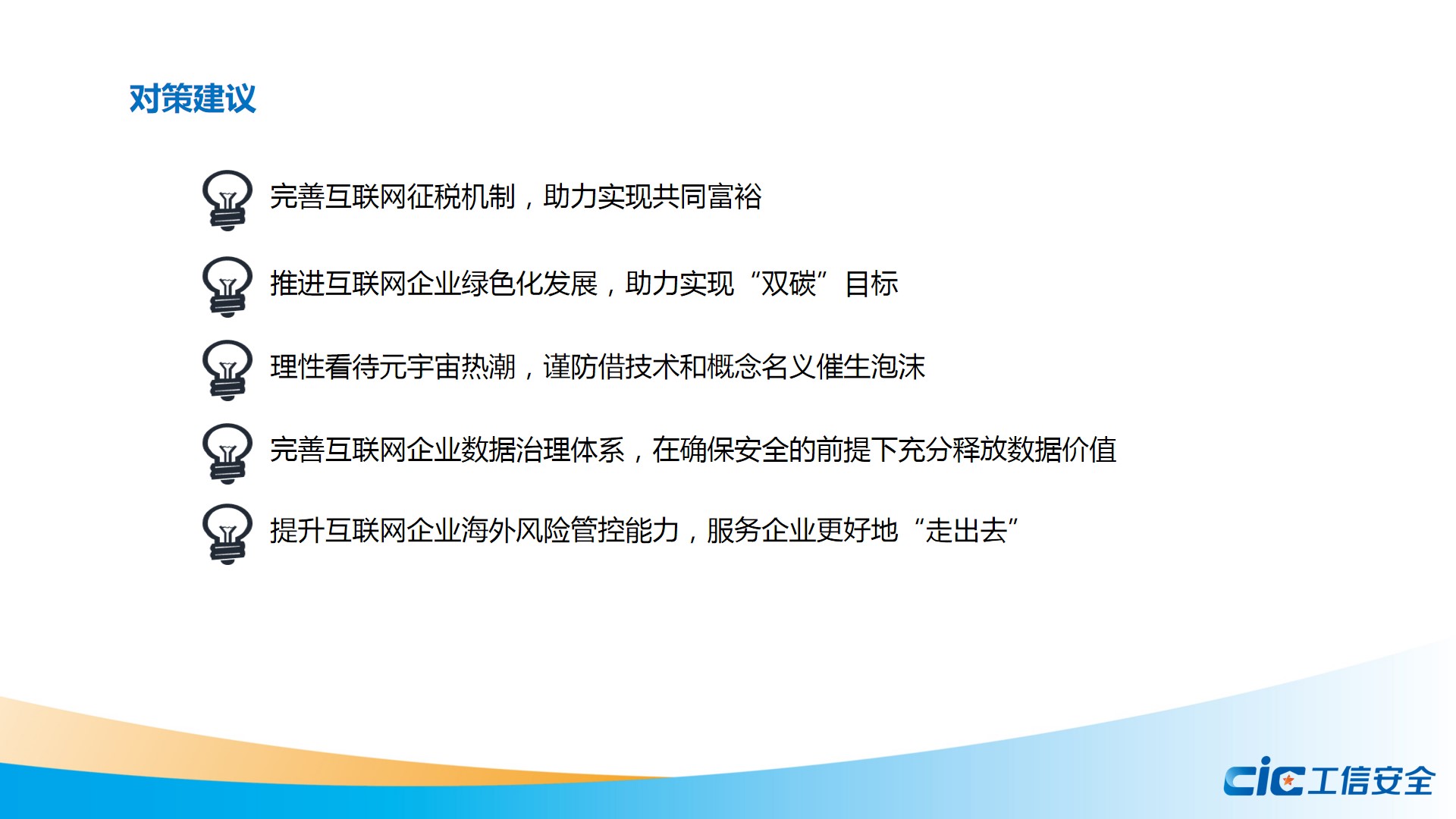針對(duì)這些問題,報(bào)告建議完善對(duì)互聯(lián)網(wǎng)企業(yè)的征稅機(jī)制,解決區(qū)域間稅收利益分配不公平不合理問題,強(qiáng)化對(duì)線上商戶和網(wǎng)紅主播的稅收稽查,穩(wěn)妥推進(jìn)共同富裕。引導(dǎo)企業(yè)設(shè)立“雙碳”目標(biāo)及完成的時(shí)間線路圖,以數(shù)字化賦能綠色化發(fā)展。理性看待元宇宙熱潮,謹(jǐn)防借技術(shù)和概念名義催生泡沫,讓元宇宙賽道回歸到夯實(shí)數(shù)字技術(shù)研究的基本面上來。探索建立公共管理領(lǐng)域的企業(yè)數(shù)據(jù)專員制度,完善數(shù)據(jù)跨境流動(dòng)管轄與信任體系,以堅(jiān)持共享共用、激勵(lì)價(jià)值創(chuàng)造為根本遵循,充分釋放平臺(tái)數(shù)據(jù)社會(huì)價(jià)值。鼓勵(lì)引導(dǎo)數(shù)字企業(yè)“抱團(tuán)出海”,探索差異化發(fā)展路徑,提升互聯(lián)網(wǎng)企業(yè)海外風(fēng)險(xiǎn)管控能力,服務(wù)企業(yè)更好地“走出去”。
