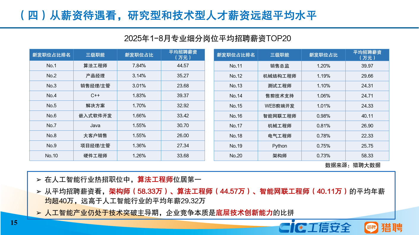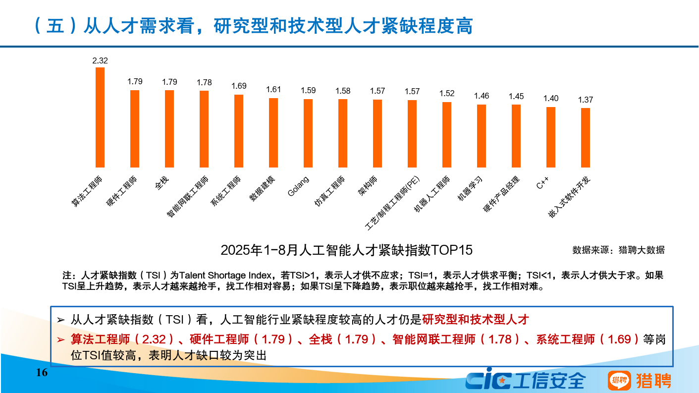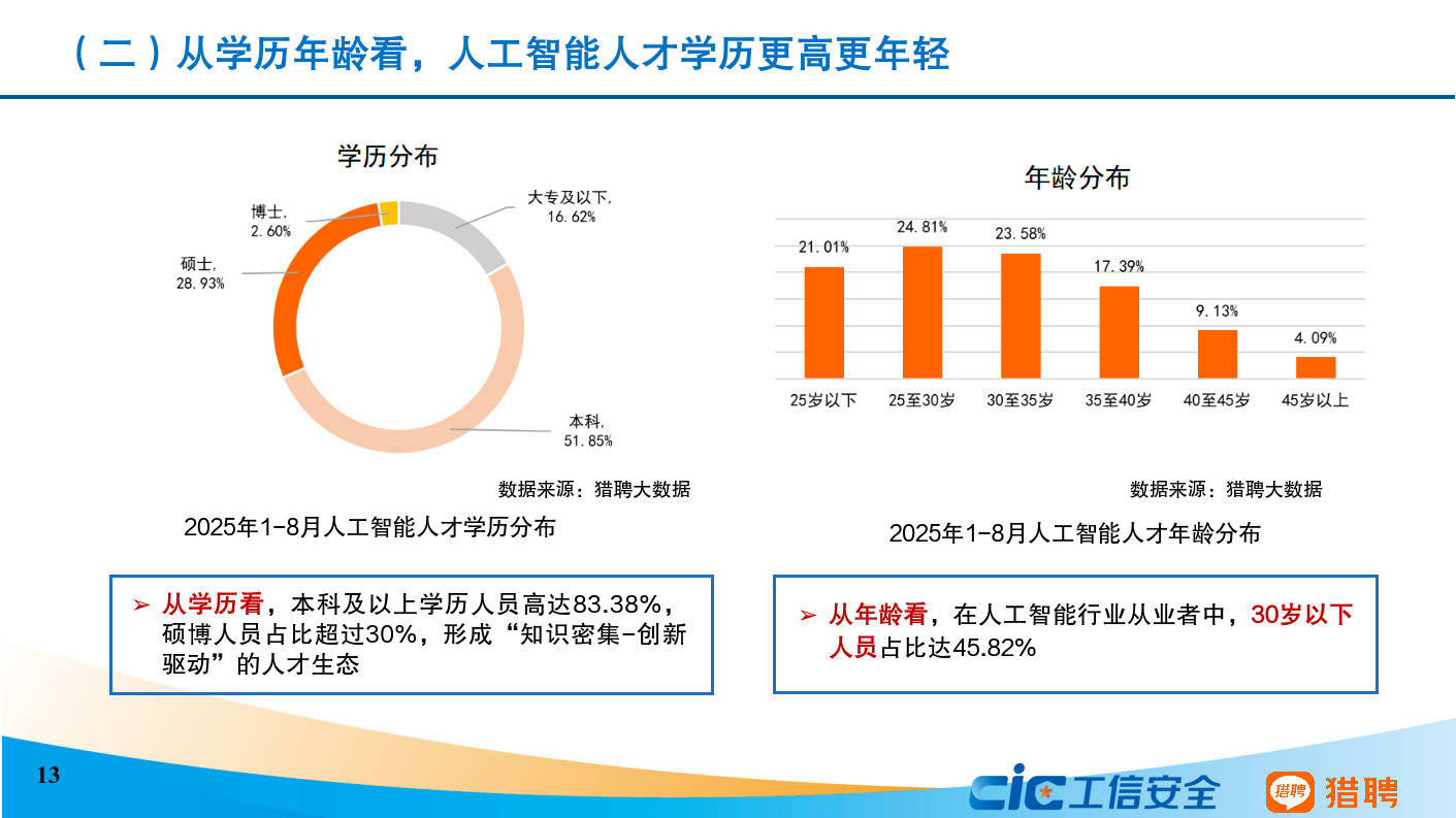 從發(fā)展態(tài)勢來看,當(dāng)前我國人工智能人才發(fā)展呈現(xiàn)六個主要特點(diǎn)。一是我國積極推進(jìn)全學(xué)段、全社會人工智能教育,以及勞動者人工智能能力建設(shè)。二是人工智能人才呈現(xiàn)學(xué)歷更高、更年輕的特征,30歲以下人員占比達(dá)45.82%,本科及以上學(xué)歷人員高達(dá)83.38%。三是技術(shù)研發(fā)和商業(yè)應(yīng)用協(xié)同發(fā)展。算法工程師崗需求占比最高,非技術(shù)型崗位需求同樣占據(jù)重要位置。四是研究型和技術(shù)型人才薪資遠(yuǎn)超平均水平,架構(gòu)師等底層技術(shù)職業(yè)的平均年薪超過人工智能行業(yè)平均水平。五是研究型和技術(shù)型人才高度緊缺。六是人工智能技術(shù)已突破行業(yè)邊界,其人才吸引力輻射范圍遠(yuǎn)超傳統(tǒng)行業(yè)。