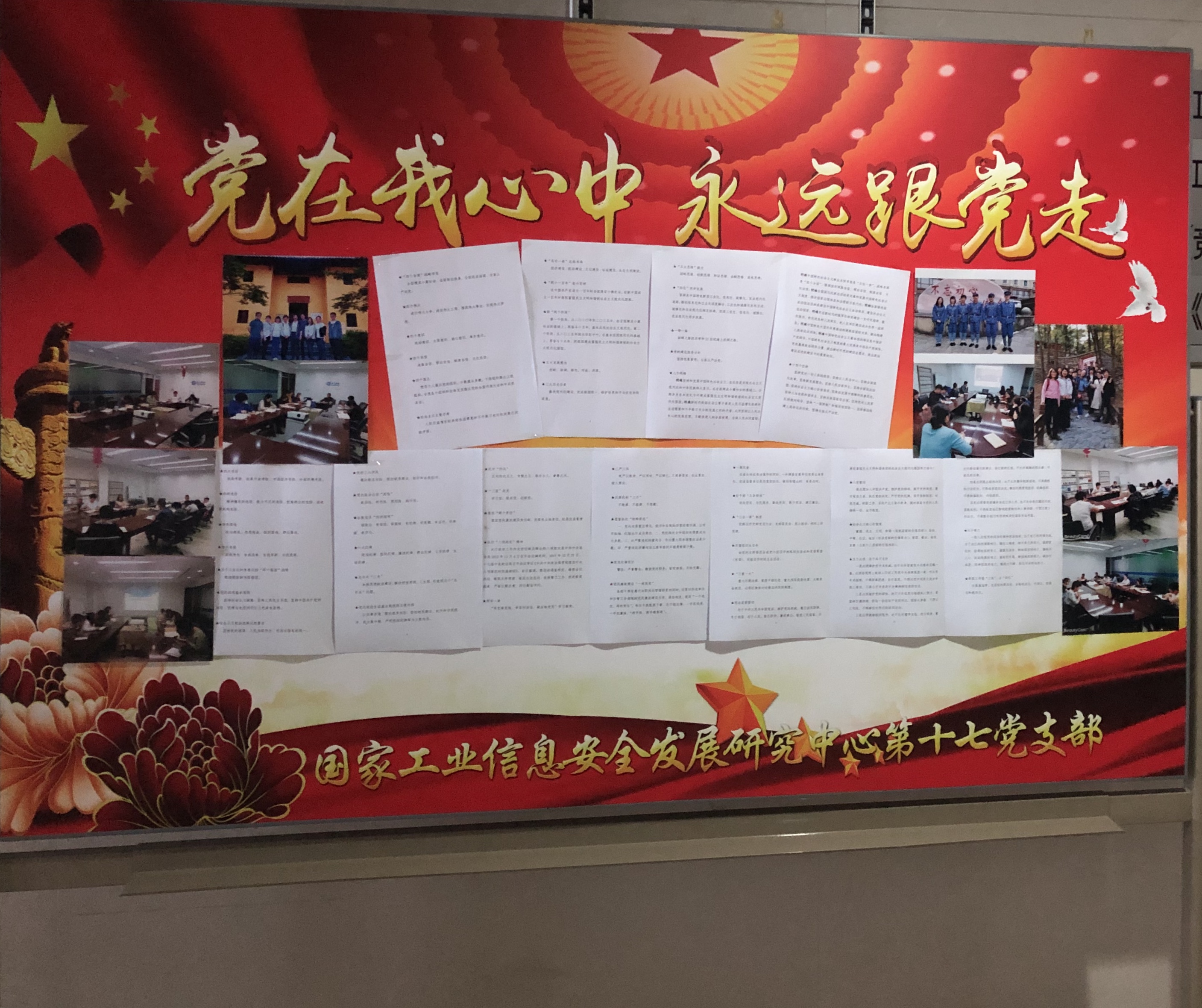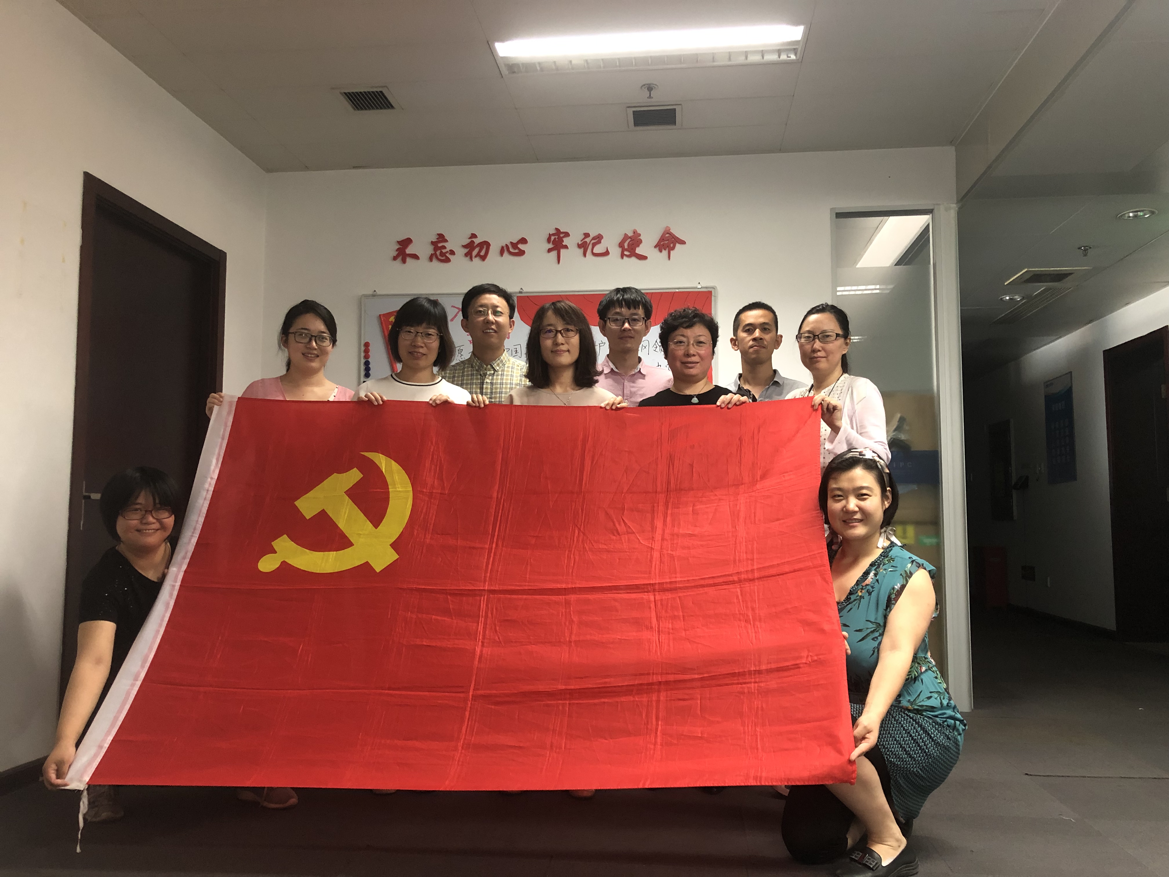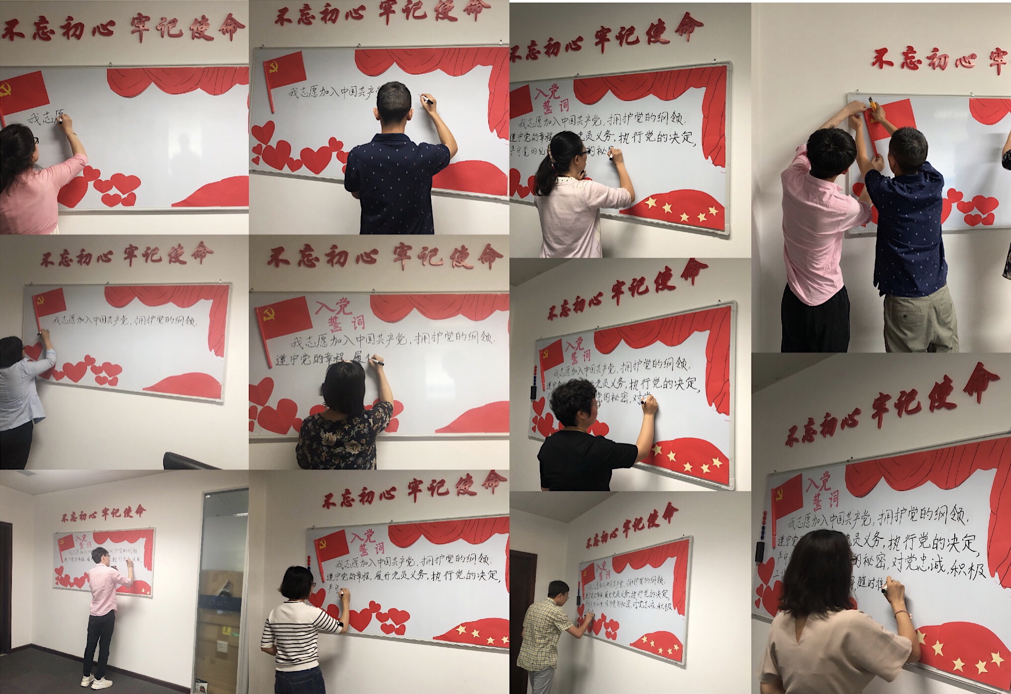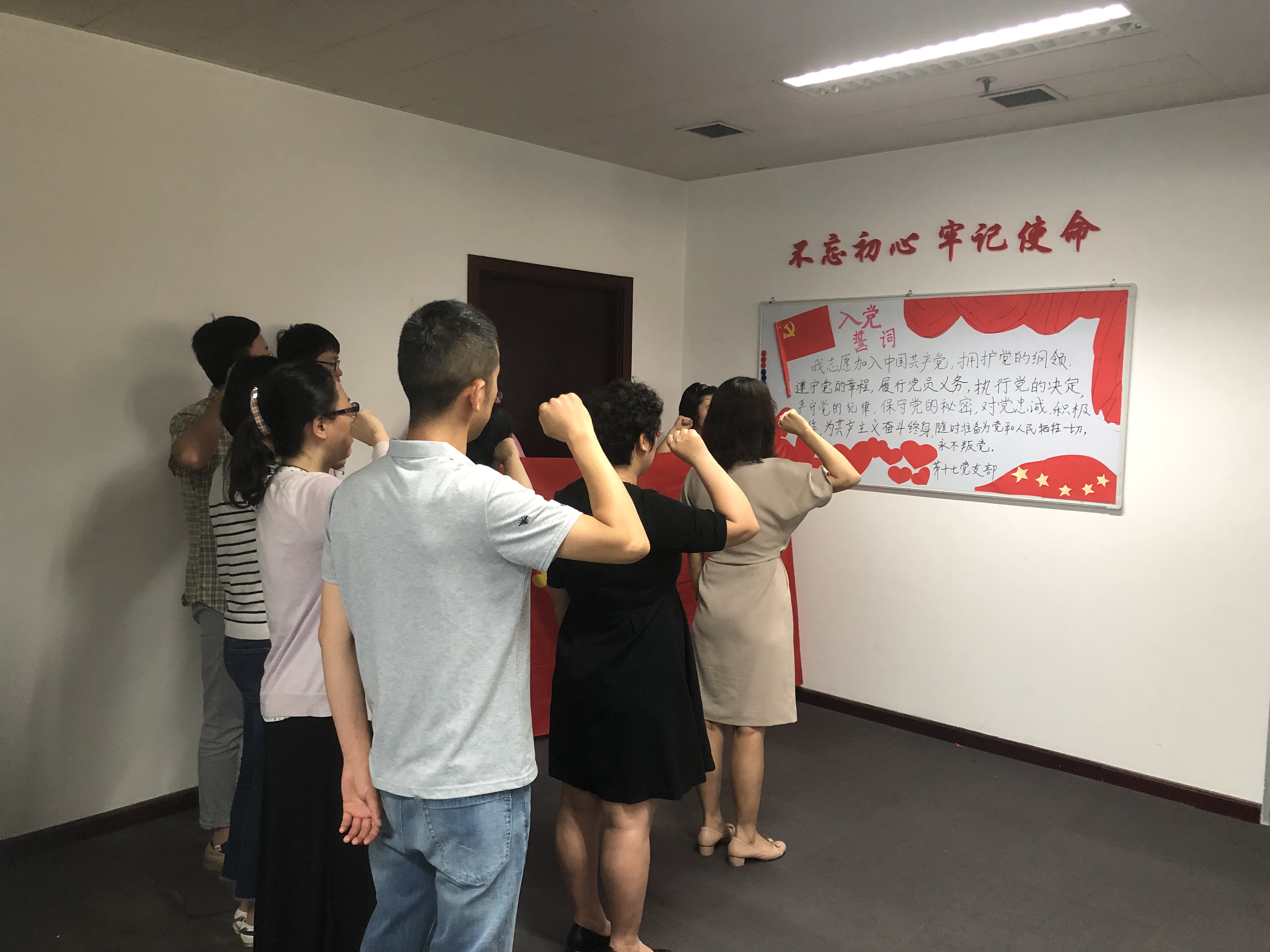 7月1日黨的生日當天,第十七黨支部全體黨員一起布置了“不忘初心、牢記使命”宣傳欄,共同策劃、繪制、剪貼、撰寫了主題板報。黨員們親手制作了黨旗,并依次在板報上鄭重寫下入黨誓詞。
