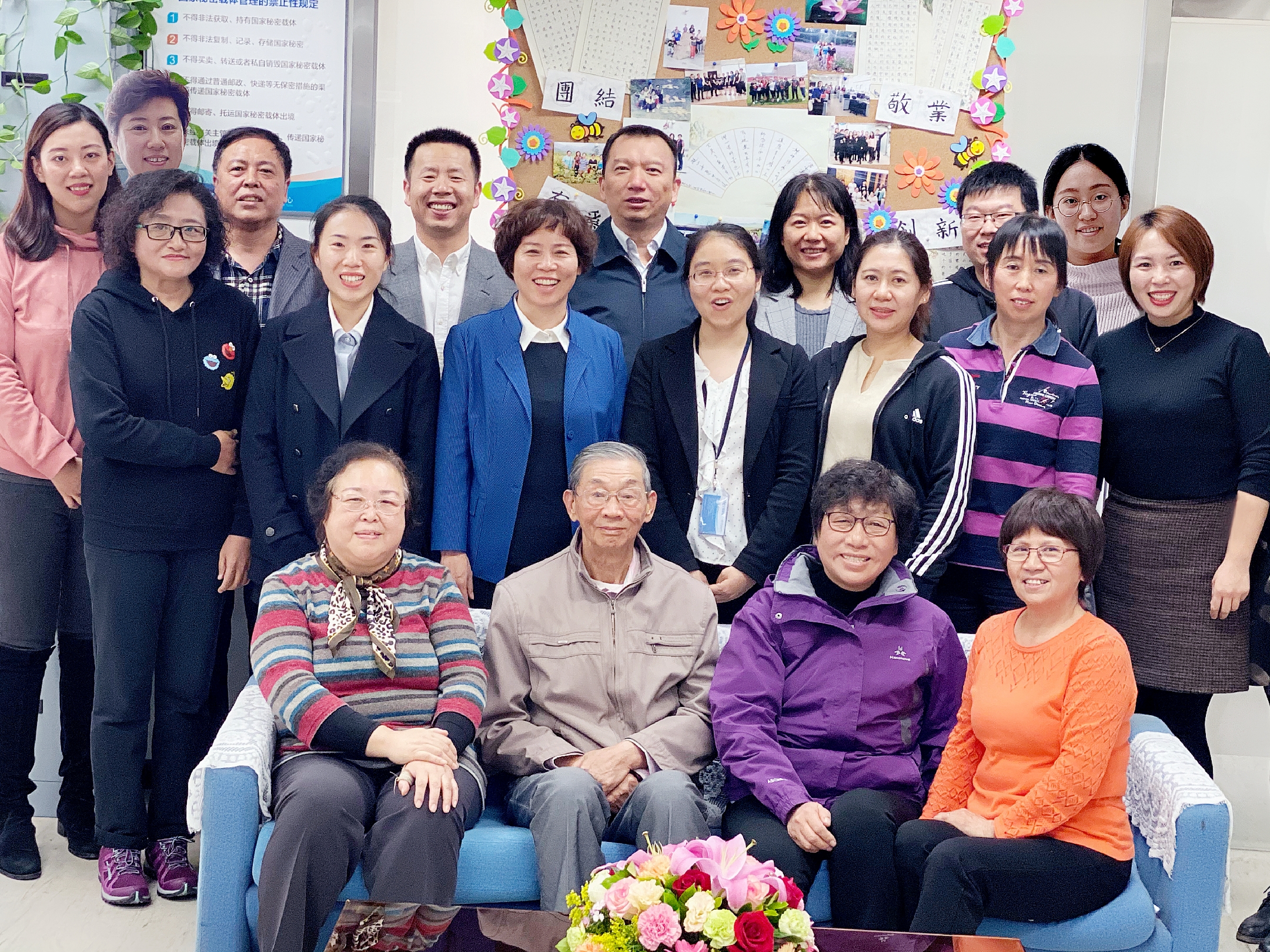 為慶祝中心成立六十周年,2019年10月18日中心第四黨支部組織召開主題黨日活動,邀請財務處退休的錢順昌、劉淑珍、戴軍、張月娟等4位老同志與支部黨員和積極分子歡聚一堂,開展聯誼座談會,共話中心發展。中心黨委書記、副主任程曉明同志專程到會。